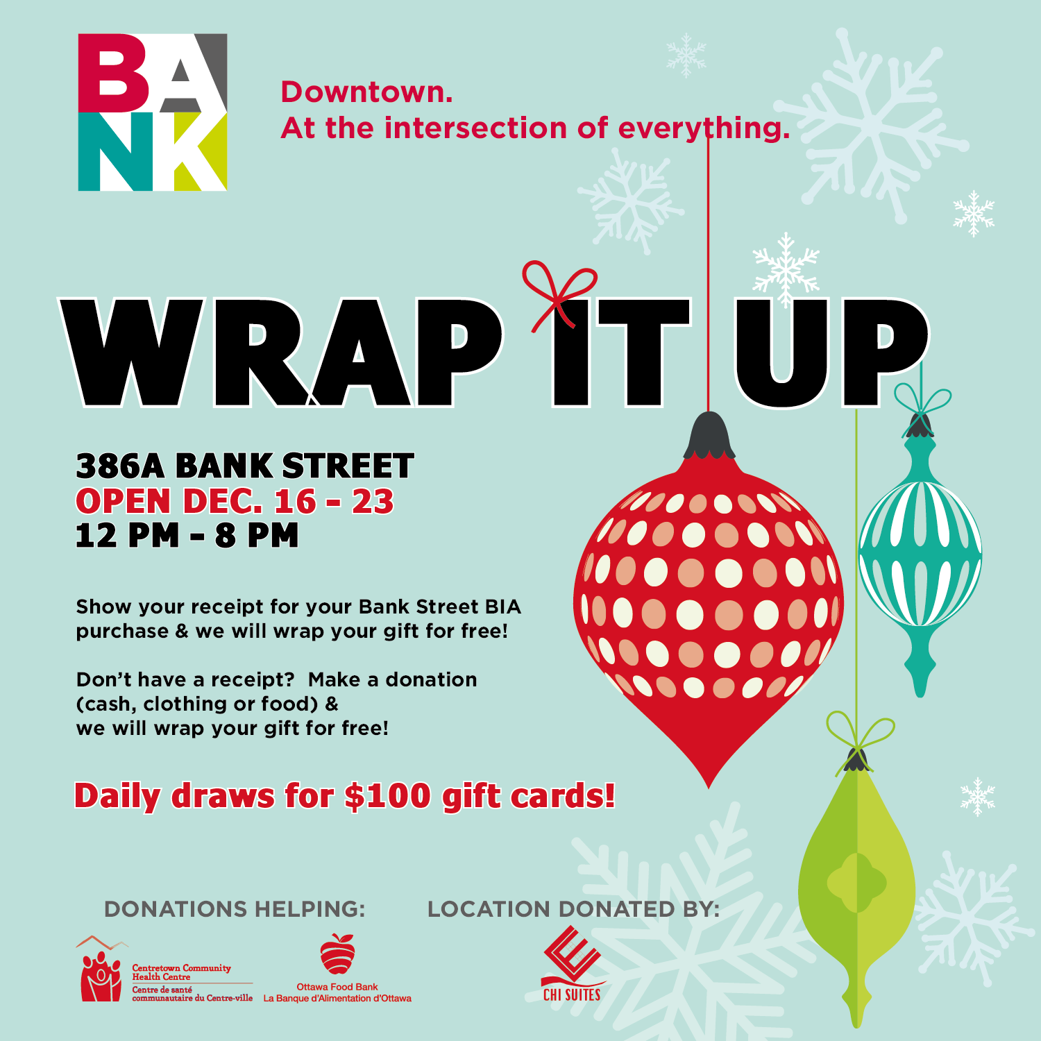 At the collection centre, monetary or canned food donations can be made. In exchange, the BIA’s elves will wrap any presents you bring in. Gifts purchased from BIA members can also be wrapped with the presentation of a receipt. The giving doesn’t stop there, however. For helping out this worthy cause, you will also be entered into a daily draw for a $100 Bank Street gift card.